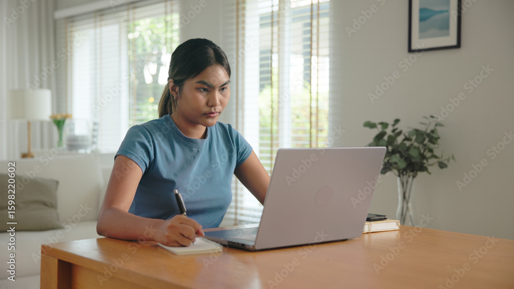 Young adult Gen Z people black asia woman happy busy work at home office using laptop AI search data hybrid workplace. Stock trade IT reskill upskill asian cyber typing coding. Online income tax apply