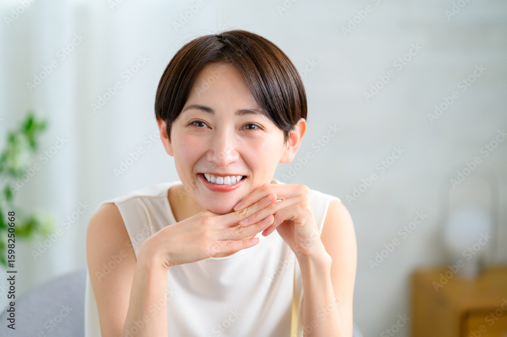ノースリーブで明るい部屋にいる日本人女性のビューティーイメージ