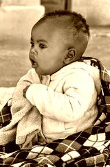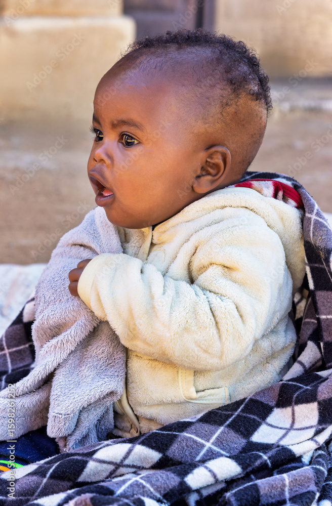 Africa village, african baby child sited in the yard wrapped in blankets , outdoors in the yard .