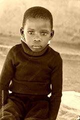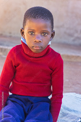 Africa village, african child sited on a blanked on the ground outdoors in the yard