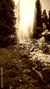 A mesmerizing geyser erupts in the Ala-Kul Lake area, Kyrgyzstan, amidst a lush alpine meadow and towering coniferous trees. The sun's rays illuminate the cascading water, creating a magical, tranquil