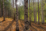 Sunbeams illuminate a birch forest floor covered in fallen autumn leaves. The scene evokes serenity and the beauty of nature's seasonal change. Golden light filters through the trees.