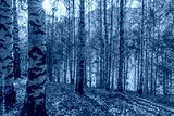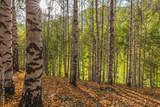 Sun rays illuminate a birch forest in autumn. Golden leaves carpet the ground. Peaceful and serene nature scene, ideal for fall themes.