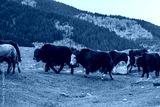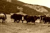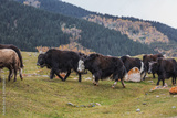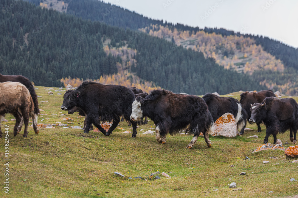 Herd of majestic yaks grazing peacefully in the picturesque Altai Mountains. Their long, thick coats provide warmth against the crisp mountain air. A stunning display of wildlife in a remote, natural
