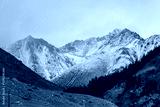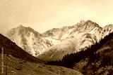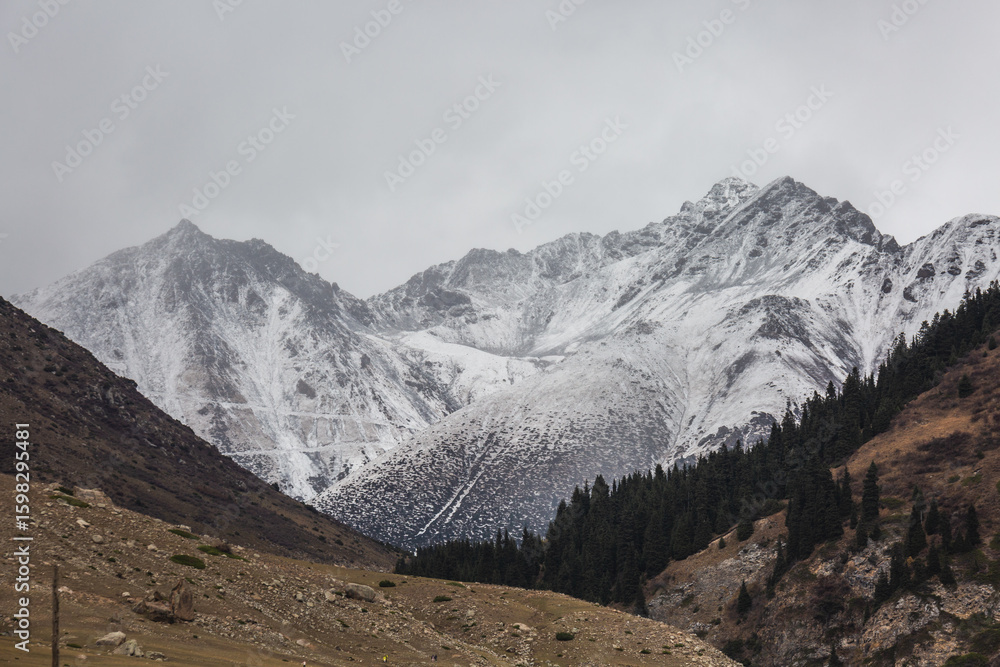 Majestic snow-capped mountains in the Tian Shan range, Kazakhstan. A serene landscape featuring rocky terrain and evergreen forests under a cloudy sky. Ideal for nature, travel, and adventure themes.