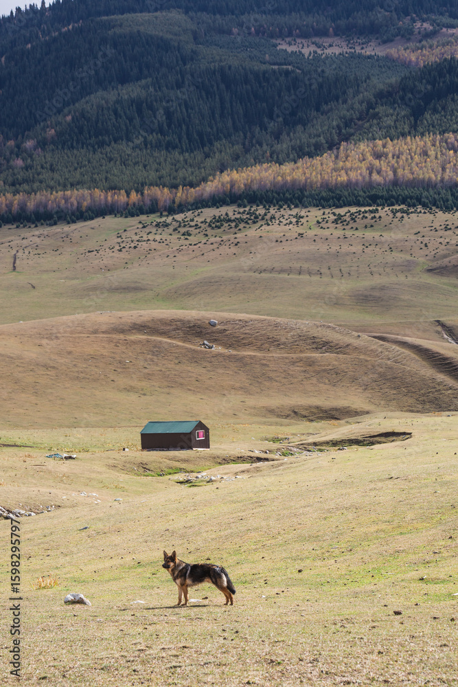 German Shepherd dog standing in a vast mountainous landscape of Kazakhstan. A small cabin is visible in the distance, surrounded by rolling hills and a forest. Serene autumnal scene.