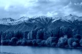 Majestic snow-capped mountains in Kyrgyzstan rise above a serene lake, framed by vibrant autumn foliage. The colorful trees along the lakeshore create a stunning contrast against the imposing mountain