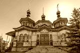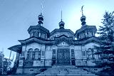 The majestic wooden Church of the Transfiguration in the village of Kolyvan, Altai Krai, Russia. Its intricate carvings and vibrant colors showcase traditional Russian architecture. A stunning