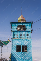 Weathered turquoise minaret of a mosque, detailed wooden structure with a crescent moon on top. Located in a Central Asian village, the image showcases traditional architecture and religious