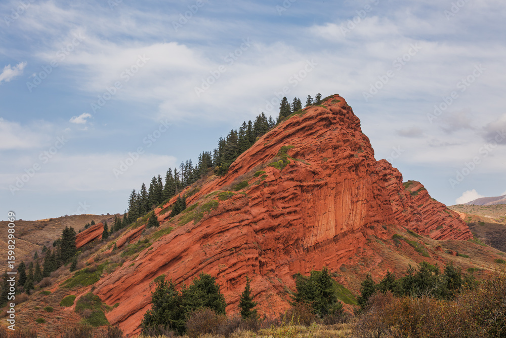 Majestic red rock formation in the Charyn Canyon, Kazakhstan. Striking textures and layers of sandstone are accented by evergreen trees. A stunning natural landscape.
