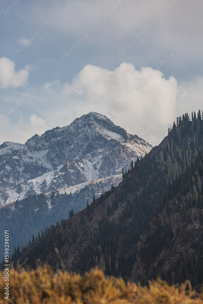 Majestic snow-capped mountains in the Tian Shan range of Kyrgyzstan rise above a dense coniferous forest. A stunning landscape of peaks and evergreens under a partly cloudy sky.