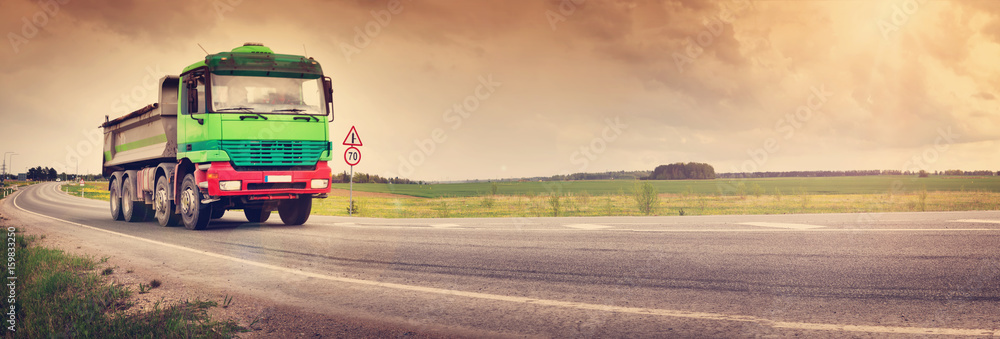 truck on asphalt road. lorry delivering cargo