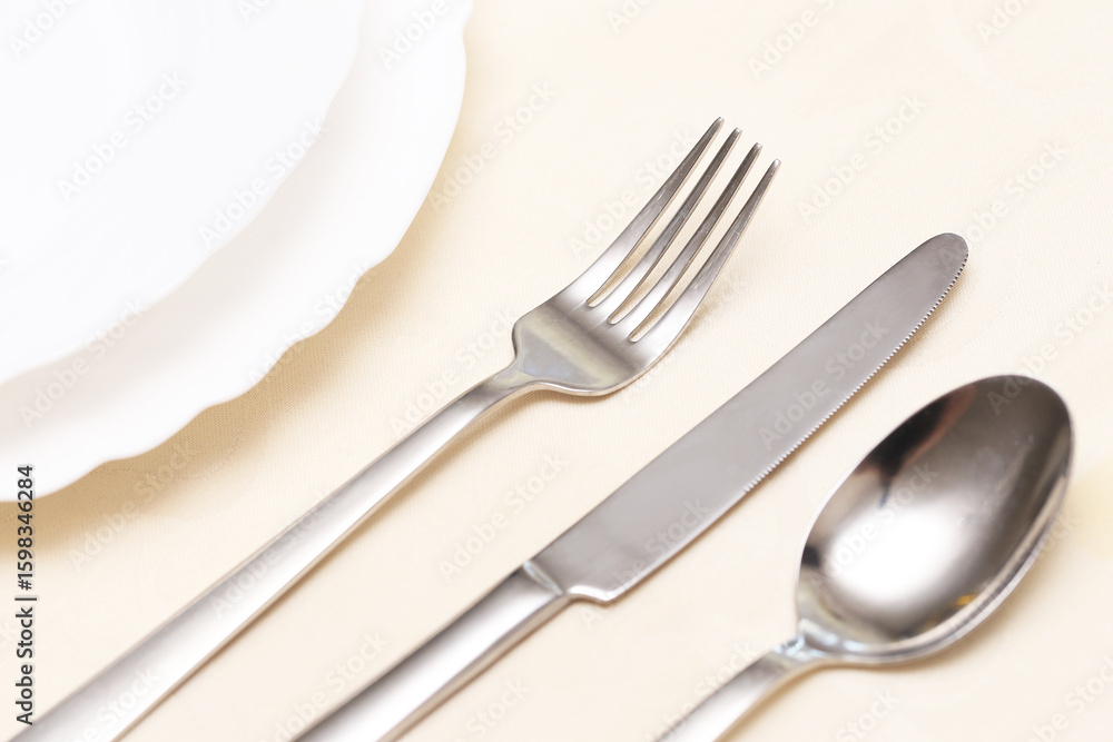 Elegant silver cutlery set. Fork knife spoon on cream tablecloth. White porcelain plate. Restaurant dining setup. Clean tableware arrangement. Formal table setting for meal. Classic style concept.