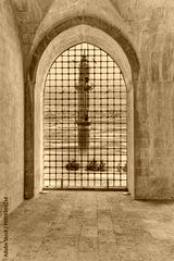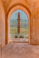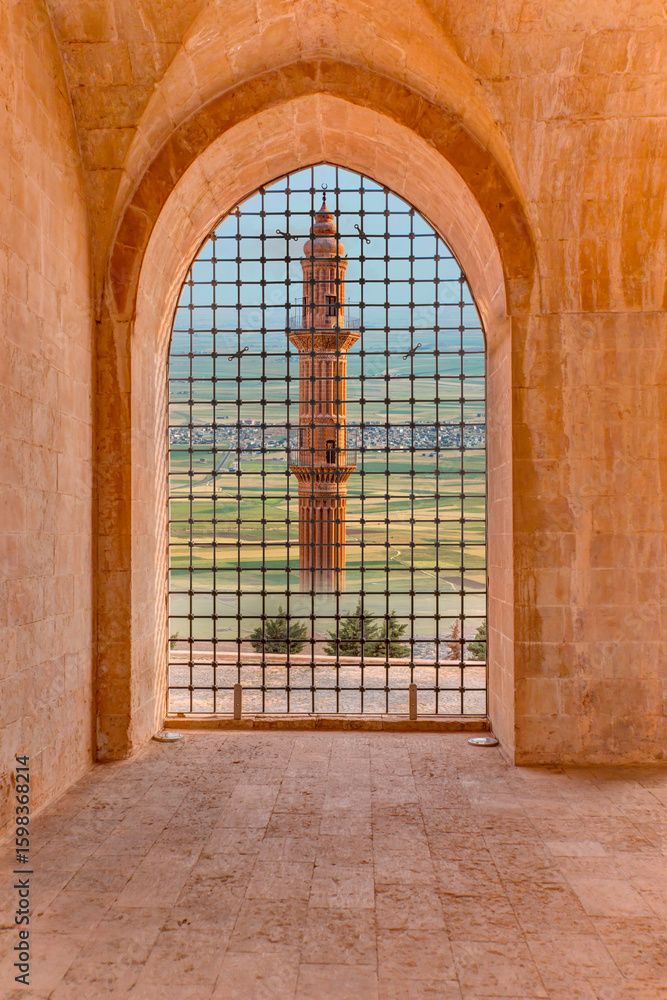 Windows of Kasimiye Madrasah on the background Mardin Sehidiye Mosque Mesopotamia in the background - Mardin, Turkey