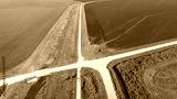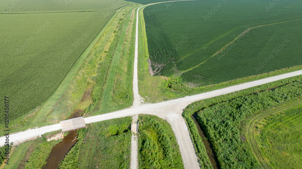 Steamboat Trace, bike trail converted from an abandoned railroad, running through Nebraska farmland near Peru, summer aerial view with green corn fields