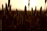 Wheat ears close-up backlit by vibrant sunrise, warm rural scene of summer field