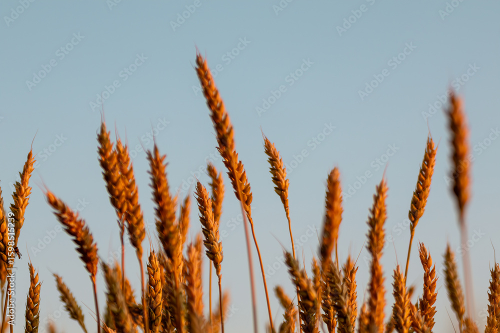 Close-up of wheat spikes in golden sunrise light on clear blue sky in summer