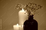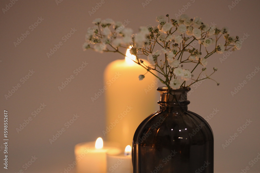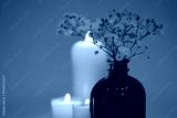 Selective soft focus Burning blur candles with flower in vase. Evening night Light and shadow gray neutral background. Minimalist still life.