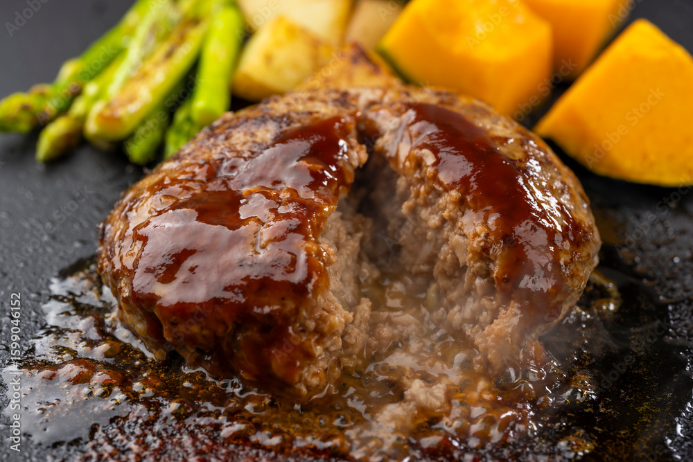 鉄板で焼いたハンバーグをカットした断面からあふれる肉汁
