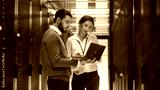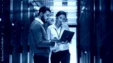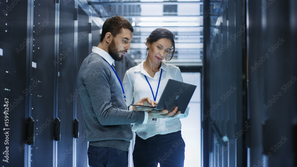 Male IT Specialist Holds Laptop and Discusses Work with Female Server Technician. They're Standing in Data Center, Rack Server Cabinet is Open.