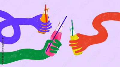 Hand drawn collage of three colorful hands clinking fruit sodas in bottles with straws on purple background. Concept of soda ads, party design, youth drinks, playful posters, fun lifestyle.