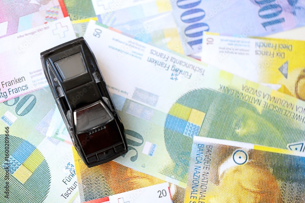 Swiss franc banknotes and toy car. The current francs money bills and black car lies on table