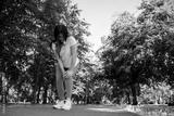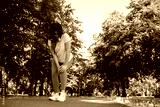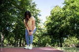 Beautiful woman with knee pain outdoors in park, painful grimace during morning warmup before running on park trail
