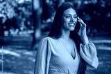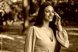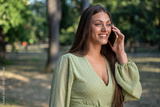 Smiling beautiful woman talking on smartphone outdoors, medium shot of happy female enjoying nature in green city park