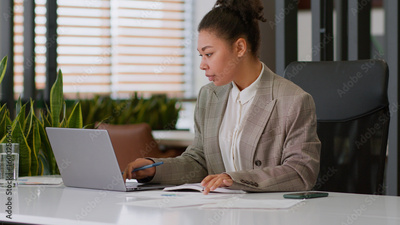 Serious ethnic woman African American girl businesswoman female employer broker agent lady business worker manager look at laptop pc screen work online computer studying learning e-commerce at office