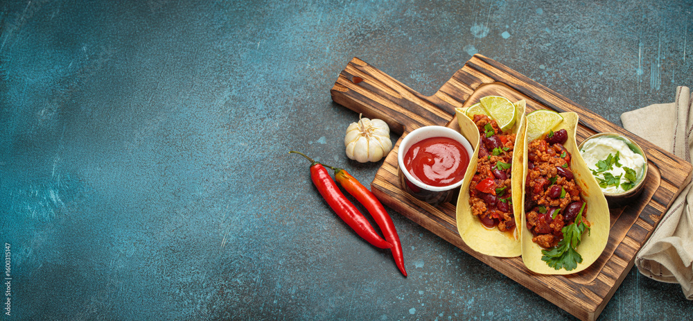 Delicious tacos with chili con carne, beans, parsley, lime, sour cream, and tomato sauce on a wooden board, a vibrant mexican culinary experience