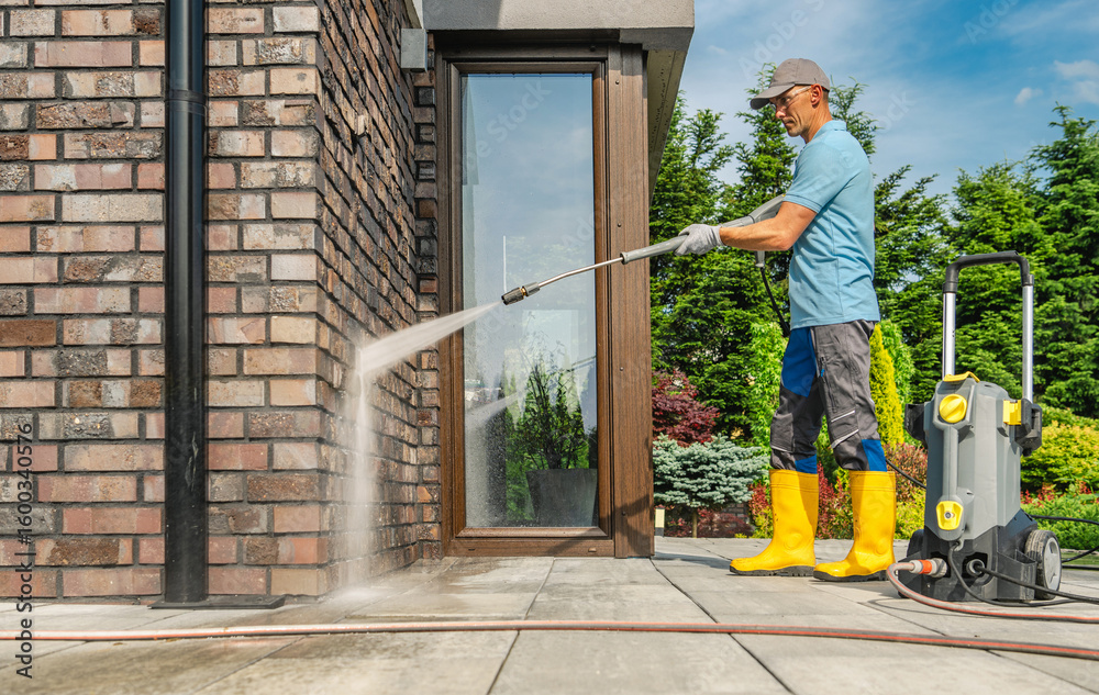 Man Using Pressure Washer to Clean Exterior of Home in Sunny Weather