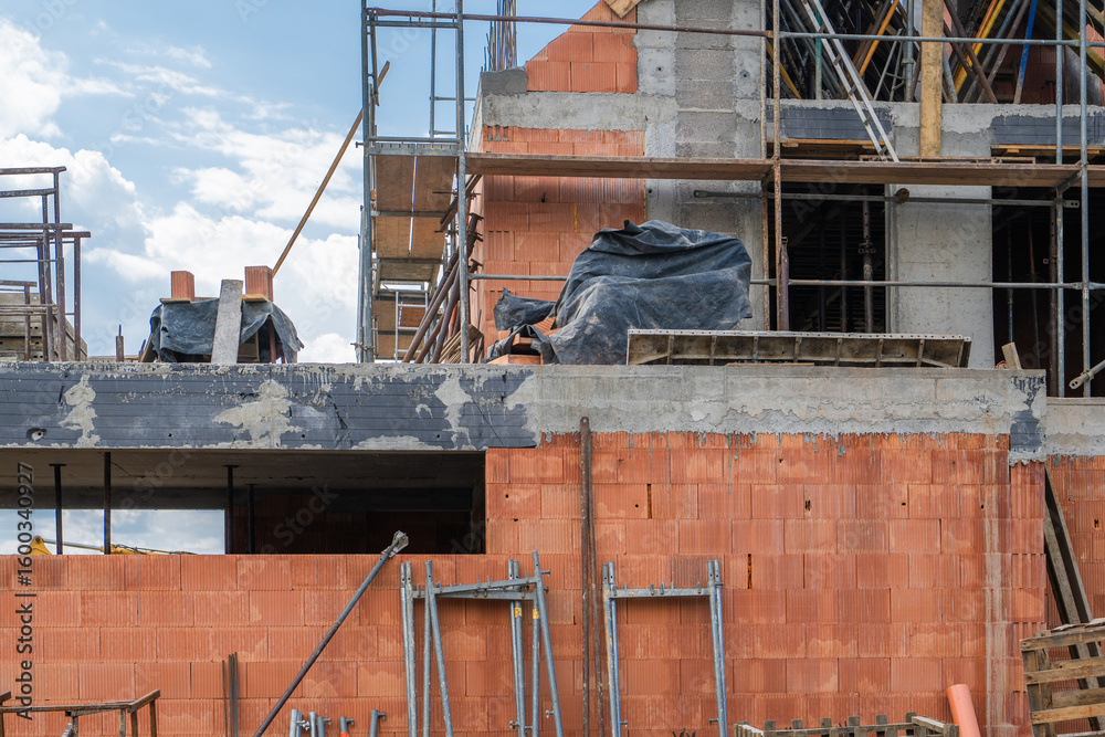 Construction Site Featuring Brickwork and Scaffolding During Daylight Hours