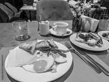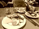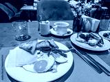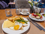 Elegant cafe breakfast presentation with cheese pastries fried eggs green beans and mixed fruit served on white porcelain plates