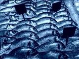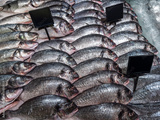 A detailed view of fresh chilled seafood symmetrically arranged in rows at a supermarket counter with empty tags for pricing