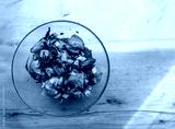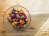 Fresh colorful vegetable salad with red and yellow tomato chunks crisp cucumber slices and shredded purple cabbage in glass bowl