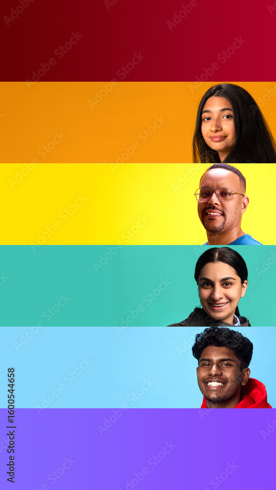 Vertical image collage of smiling people framed by color stripes on vibrant backgrounds. Concept of online learning platforms, mental health apps, youth wellness campaigns, teamwork visuals.