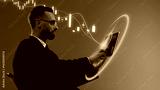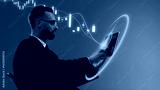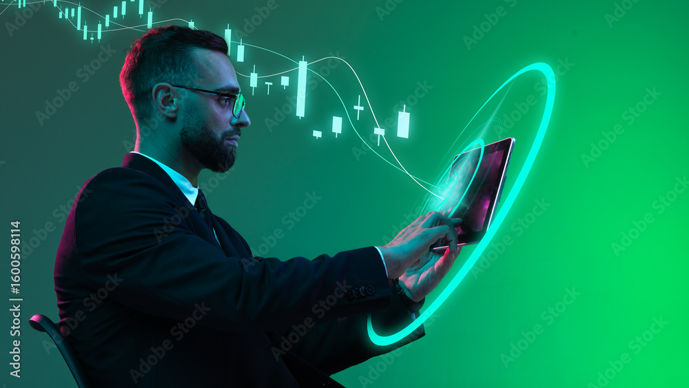 Businessman analyzing candlestick chart on digital tablet with green glow. Concept of trading dashboard, stock analytics, fintech UI, market prediction and crypto tools.