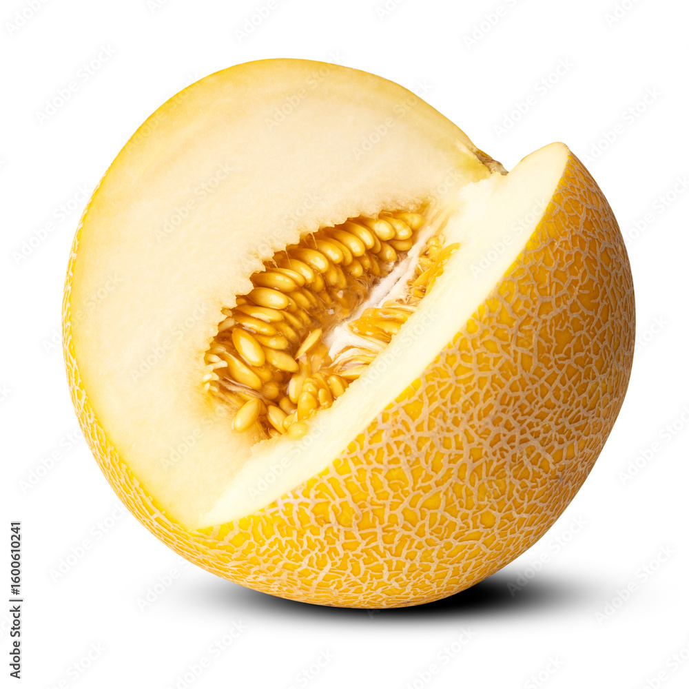 Photo of cut off slice of round yellow ripe tasty natural organic melon isolated on white background