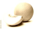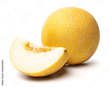 Photo of cut slice and whole round yellow ripe tasty natural organic melon isolated on white background