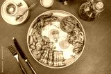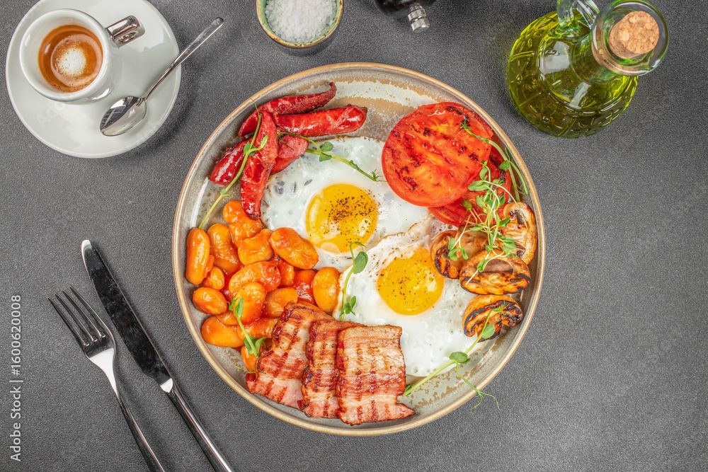 A hearty English breakfast with fried eggs, bacon, sausages, grilled tomato, beans, mushrooms, and microgreens is served alongside a fresh espresso and olive oil