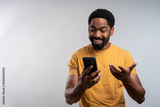 Happy black man using phone with joyful expression, isolated on white background, positive mood concept