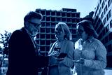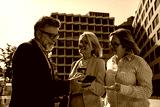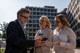 Diverse business people enjoying coffee break and chatting outdoors in corporate business district