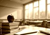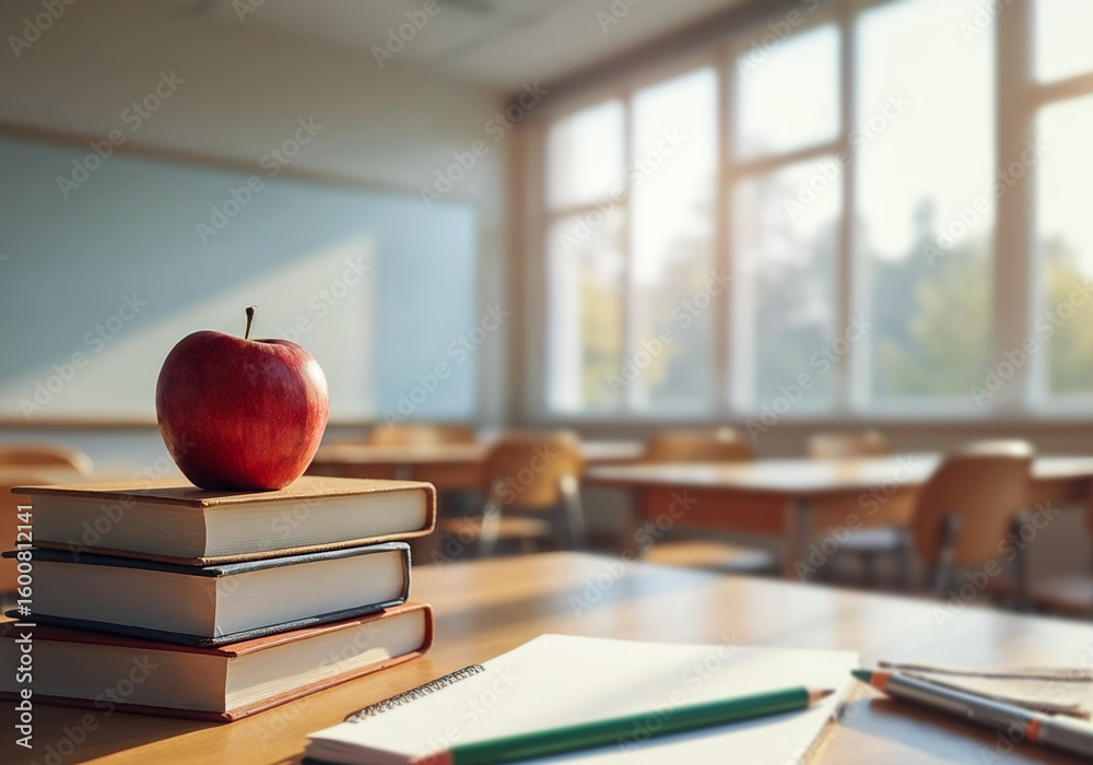 Close-up of school supplies arranged on wooden student desk, red apple and books with copy space. Blurred sunlight classroom interior background.