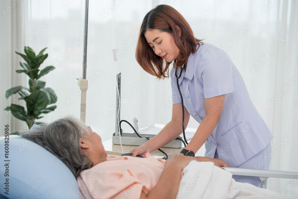 Asian nurse with tonometer measuring woman patient's blood pressure at hospital