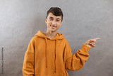 Attractive young man pointing hands to right on gray background, copy space, close up
