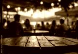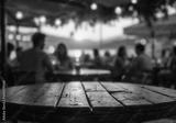 Empty rustic wooden table with copy space in pub. Background of blurred people sitting outdoor at sunset, warm, moody atmosphere. Summer and vacation vibes.