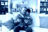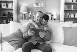 Happy, tablet and father with child in home for watching movies, cartoons and online entertainment. Family, love and dad with son on digital tech for internet, video call and relax on weekend on sofa.