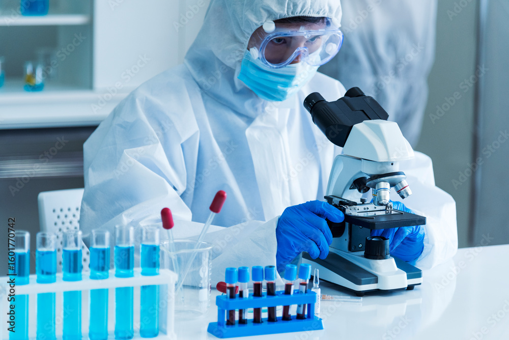 Scientist man look into Microscope research in science laboratory. Asian scientist look at microbiology microscope laboratory equipment chemistry lab. Biochemistry research experiment vaccine concept