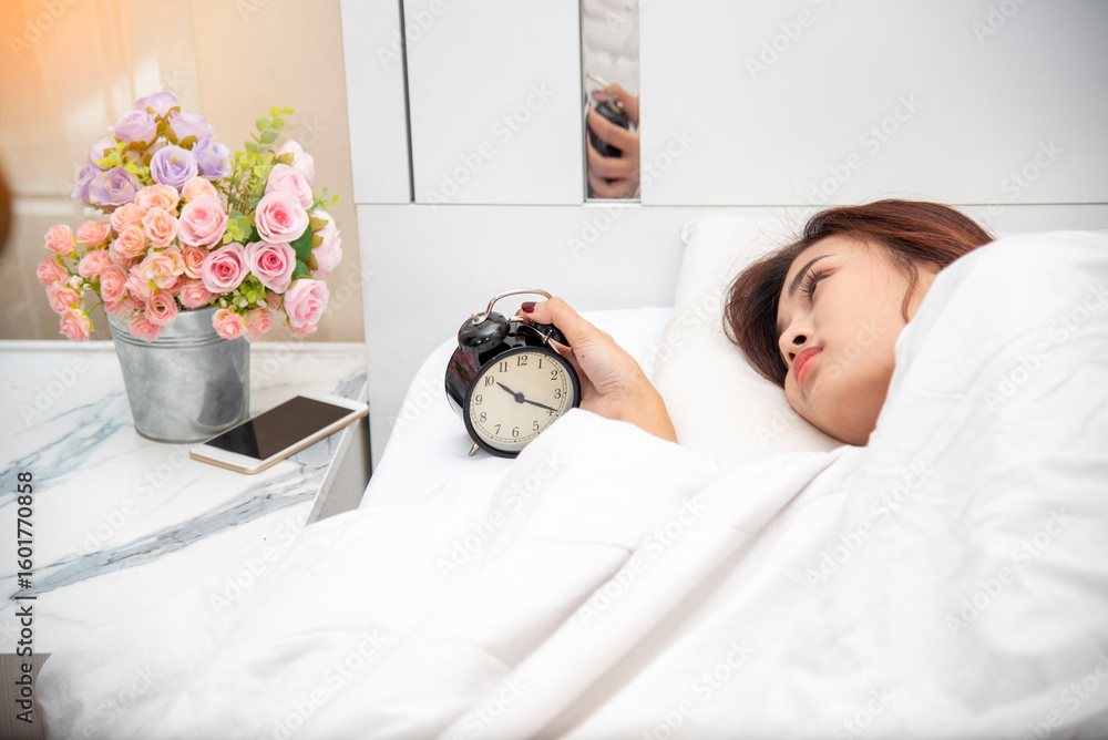 Asian women sleep wake up in white cozy bedroom happy time morning sunrise. Beautiful chinese use hand stop time alarm clock. Happy person lifestyle wake up in morning wellbeing relax sleepy napping