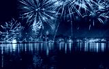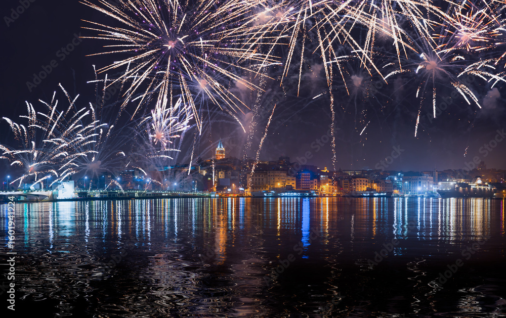 Galata Tower, Galata Bridge, Karakoy district and Golden Horn with fireworks at night - istanbul - Turkey